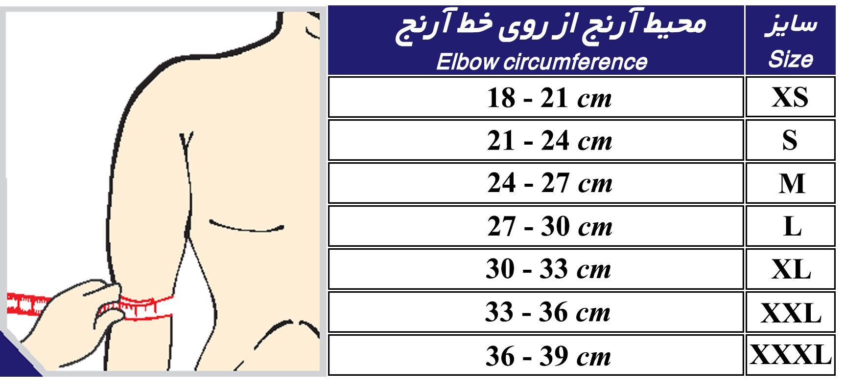 دارای چند لایه پد جهت محافظت از نواحی حساس آرنج. دارای نوار قابل تنظیم، تهیه شده از بهترین نئوپرن وارداتی همراه با پوششی از پارچه حولهای کتان، در هفت سایز مختلف قابل استفاده برای همه سنین، ضد حساسیت و قابل شستشو (در موارد درمانی با تشخیص و تجویز پزشک استفاده شود).