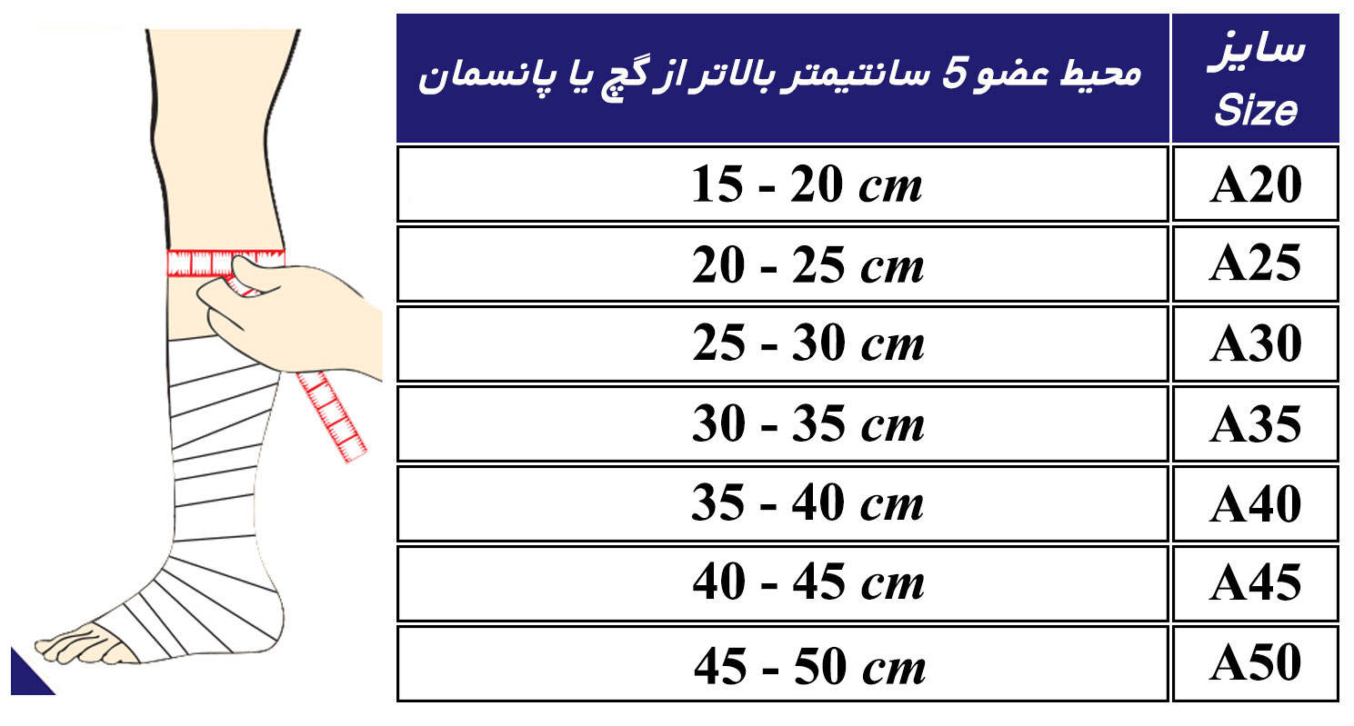 محیط عضو آسیب دیده را از 5 سانتیمتر بالاتر از جایی که از گچ یا پانسمان پوشیده شده با متر پارچهای اندازهگیری کرده، سپس بر اساس جدول ضمیمه سایز مناسب را انتخاب نمایید.